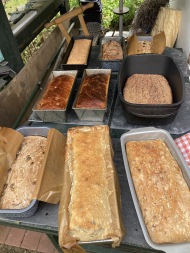 Zum Schutz vor Sonne, Wind und Regen wurde dieses Jahr das Zelt direkt neben dem Backofen aufgebaut. So konnten entspannt die Tortenkreationen von Monika gewürdigt werden, während das Brot im Ofen