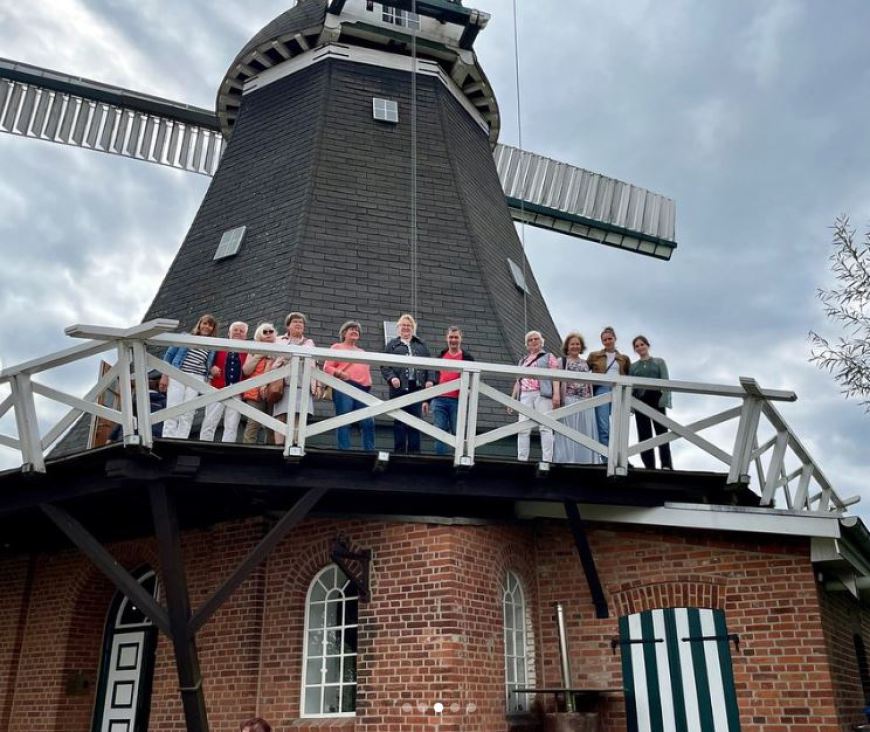 Berkenthiner LandFrauen zu Gast bei den Mühlenbesitzern Claudia und Thomas Röhler in Siebenbäumen.Verwöhnt mit köstlicher Torte von der Hausherrin Claudia lauschte man dem Vortrag des Mühlenbesitzers Thomas und durfte anschließend - wenn man sich traute - über schmale Stiegen bis ganz nach oben auf den Kornboden.