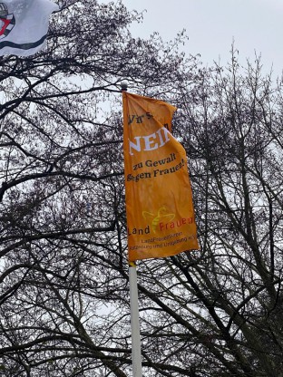 Gut sichtbar flattert die Statementfahne gegen Gewalt an Frauen an der Promenade beim Salemer Gemeinschaftshaus. Foto: Doris Günther