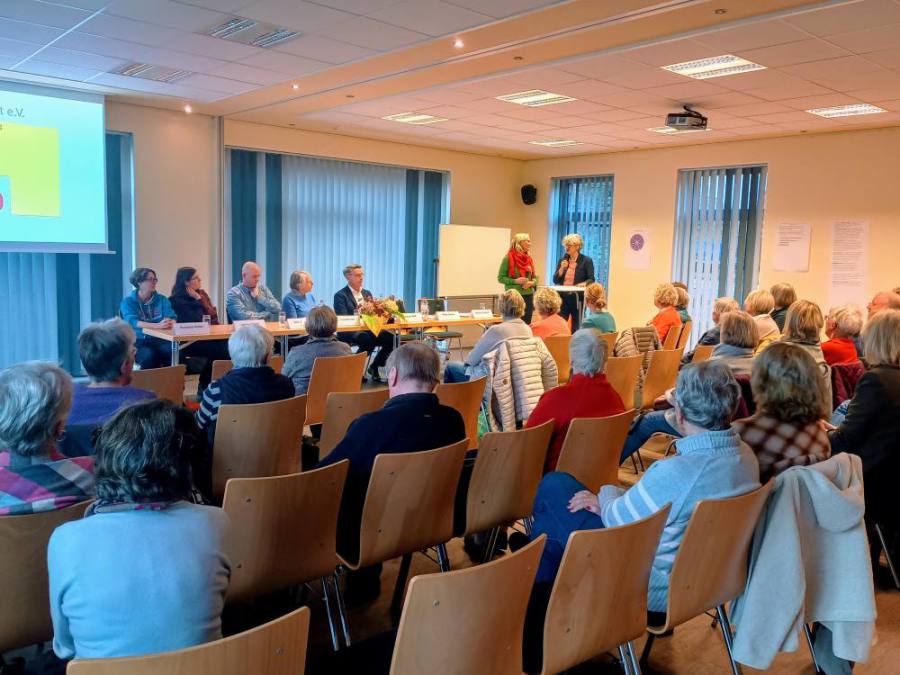 Rund 50 Besucherinnen und Besucher verfolgten aufmerksam die Beiträge auf dem Podium. Hilke Ramm, Vorsitzende des LandFrauenVereins, und Barbara Kliesch vom Salemer